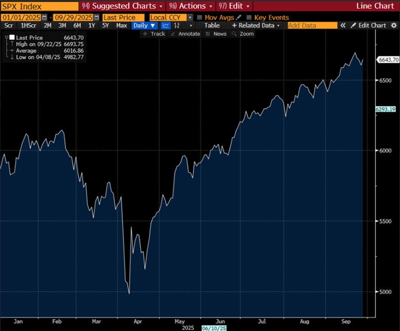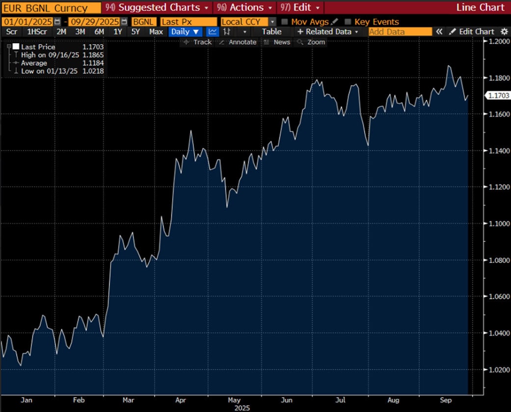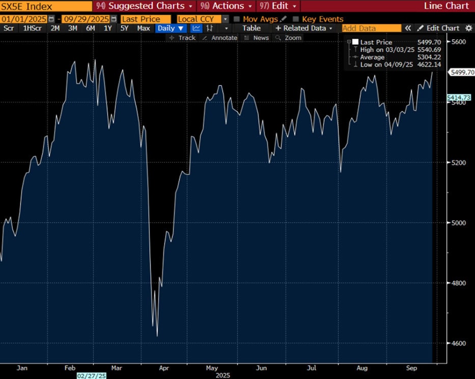 In the US, September was a particularly bullish month, with stocks rallying slightly and data supporting the economy. The geopolitical situation in the Middle East, and Ukraine in particular, does not appear to be resolving itself any time soon, as President Trump himself has stated. The Federal Reserve (Fed) made a small but significant interest rate cut of 0.25%, paving the way for growth by reducing borrowing costs, something that the market had already priced in. In economic announcements, inflation was announced at 2.9% (marginally better, heading towards the 2% target), unemployment at 4.3%, GDP grew by 3.3% in the second quarter, retail sales increased by 5% and industrial production by 0.87% (August 2025 data).